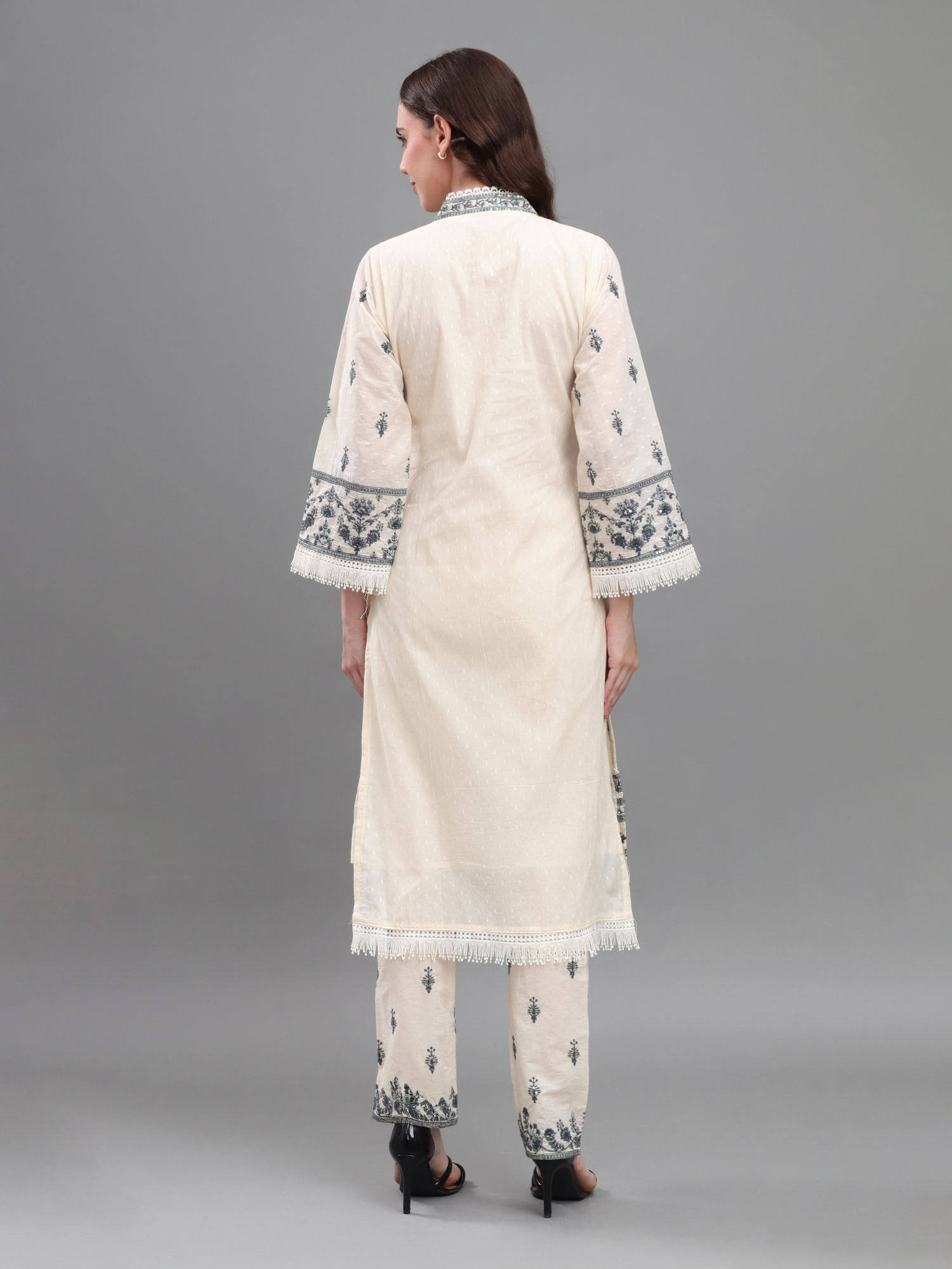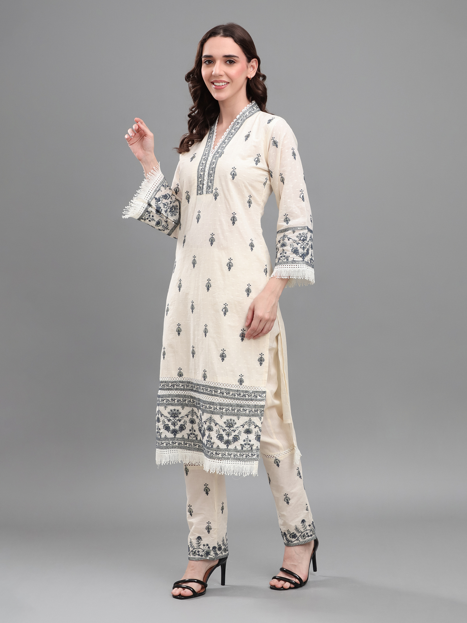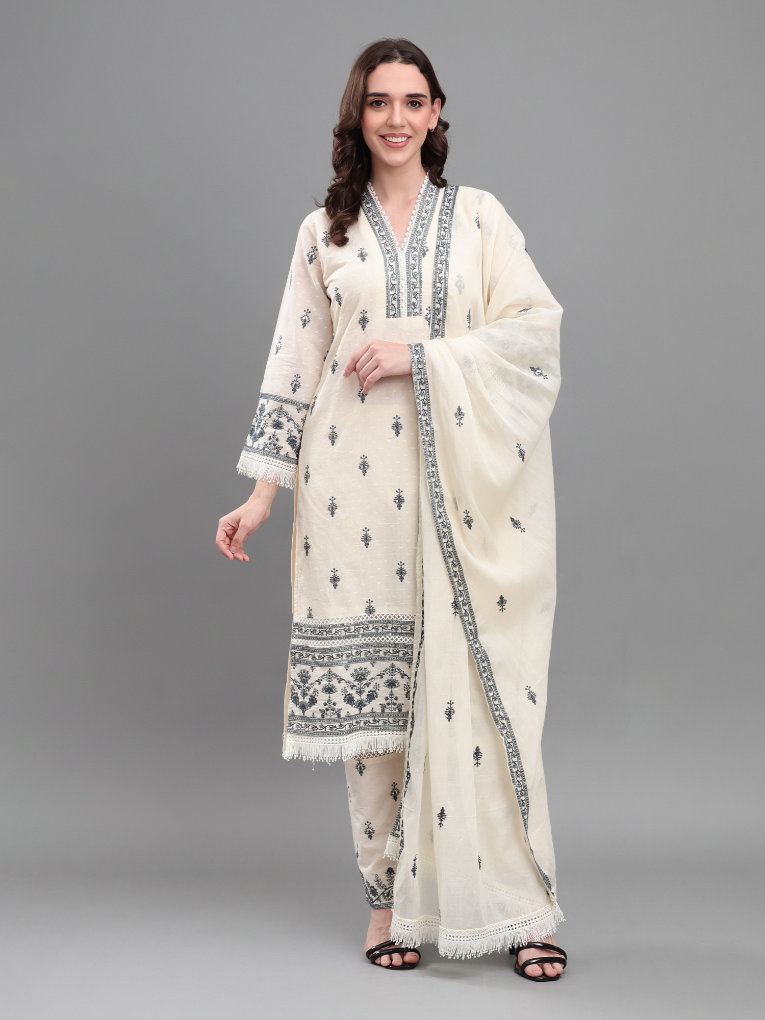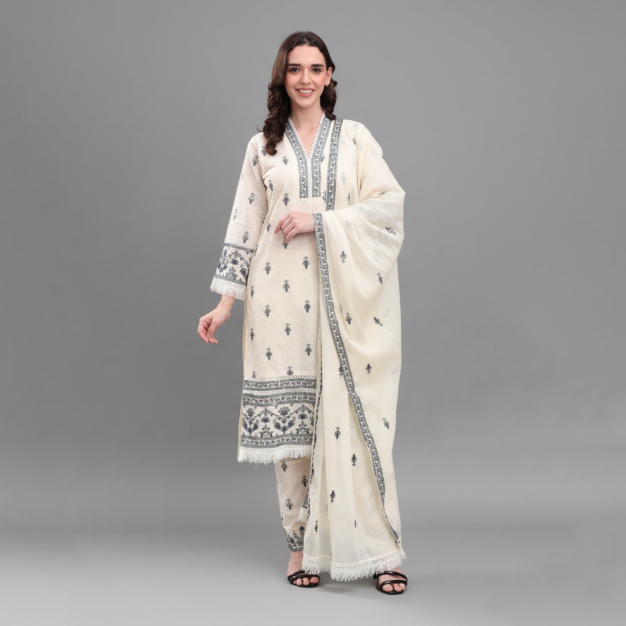 Embrace luxury and refined style with the Ivory Elegance Embroidered Set, designed for those who appreciate the beauty of traditional craftsmanship. This off-white kurta showcases meticulous black thread embroidery along the neckline, sleeves, and hem, imparting a striking contrast against the premium breathable fabric. The straight-fit pants provide a comfortable yet polished silhouette, while the fringed dupatta adds movement and grace. Ideal for festive gatherings, formal parties, or stylish day outings, this ensemble brings effortless sophistication to your ethnic wardrobe—guaranteeing compliments with every wear.