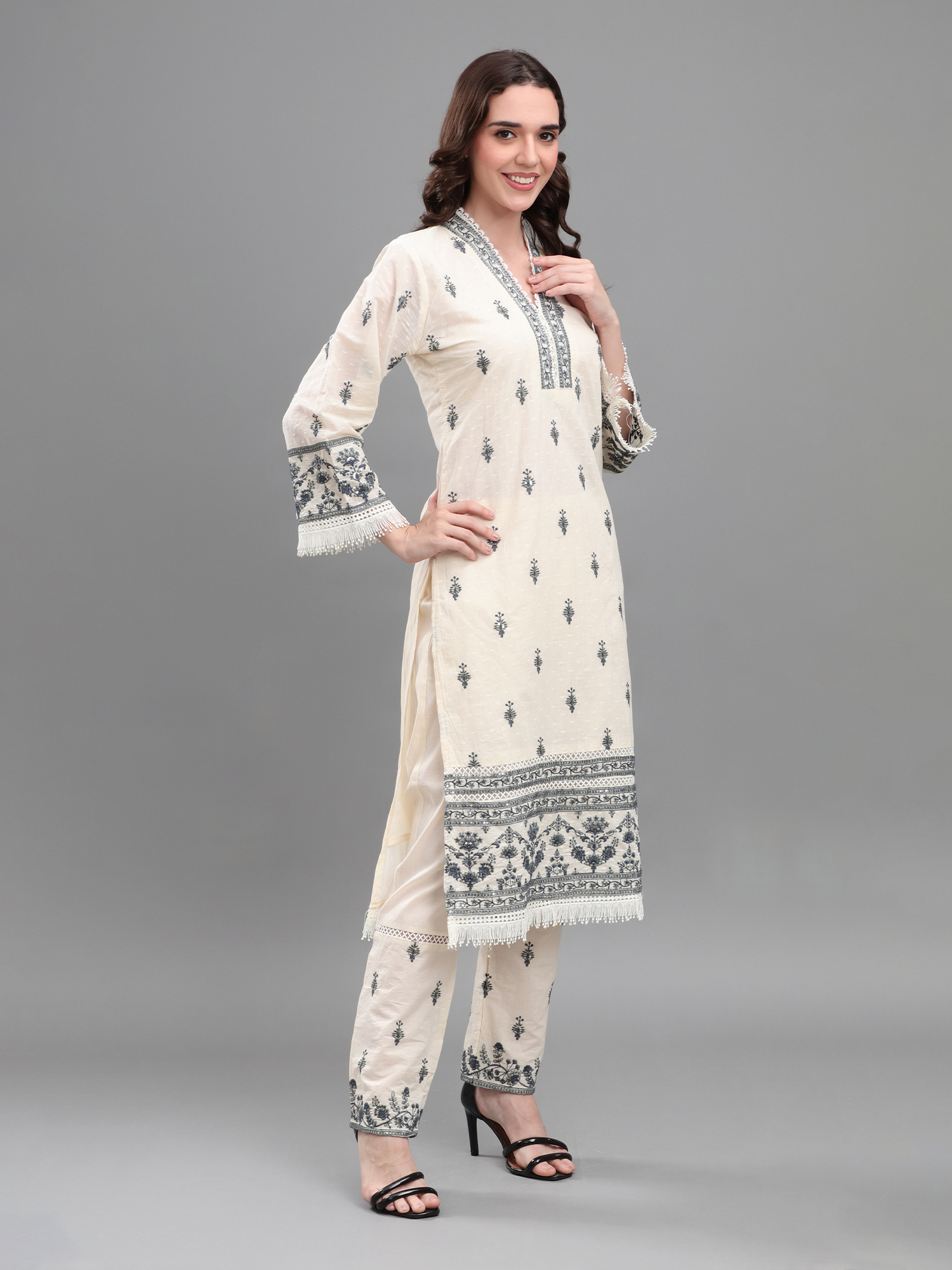 Elegant off-white embroidered kurta set with detailed noir threadwork and a chic fringed dupatta, perfect for graceful occasions.